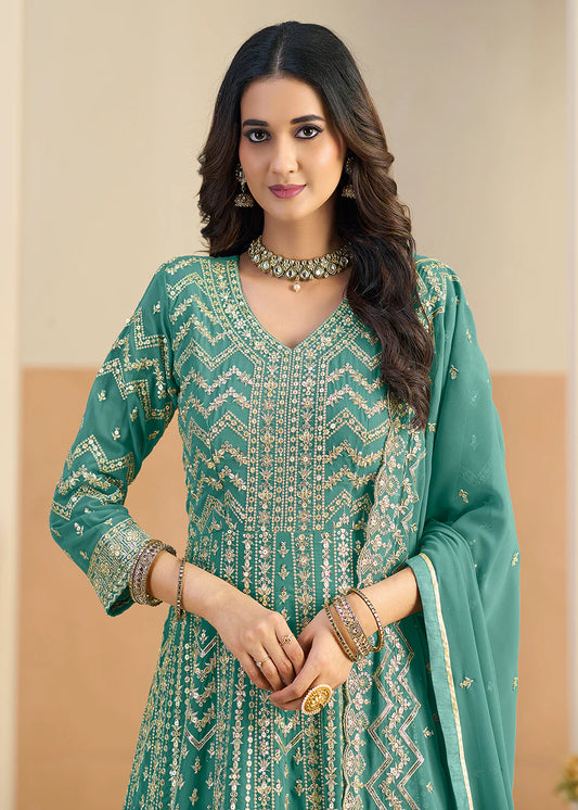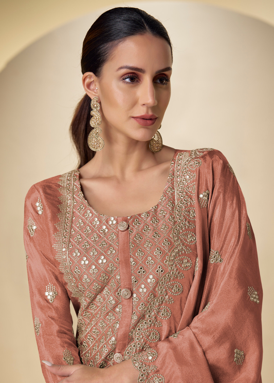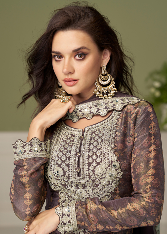 Designer Coffee Brown Chinnon Long Sleeve Palazzo Suit With Dupatta for Indian Wedding and Pakistani Festival