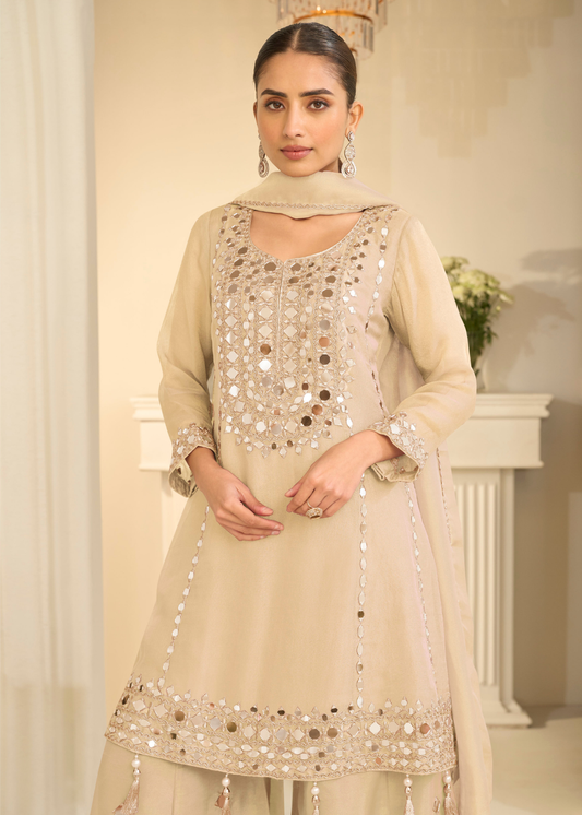 Party Wear Cream Beige Shimmer Silk Mirror Work Palazzo Suit With Dupatta
