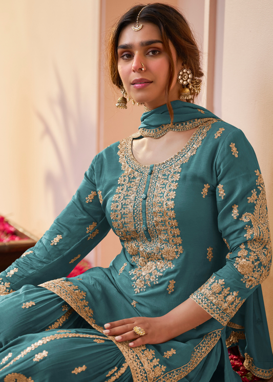 Designer Teal Green Chinnon Long Sleeve Gharara Suit With Dupatta for Indian Wedding and Pakistani Festival