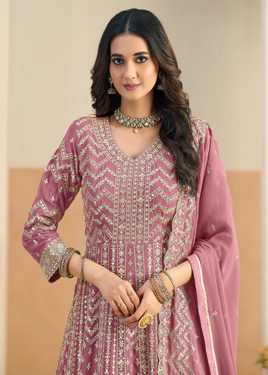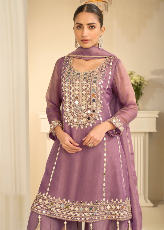 Party Wear Mauve Purple Shimmer Silk Mirror Work Palazzo Suit With Dupatta