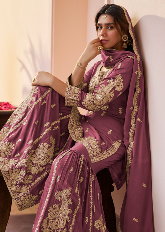 Designer Brown Chinnon Long Sleeve Gharara Suit With Dupatta for Indian Wedding and Pakistani Festival