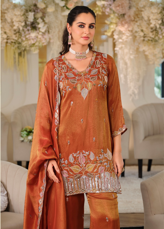 Designer Rust Orange Silk Long Sleeve Pant Style Suit With Dupatta for Indian Wedding and Pakistani Festival