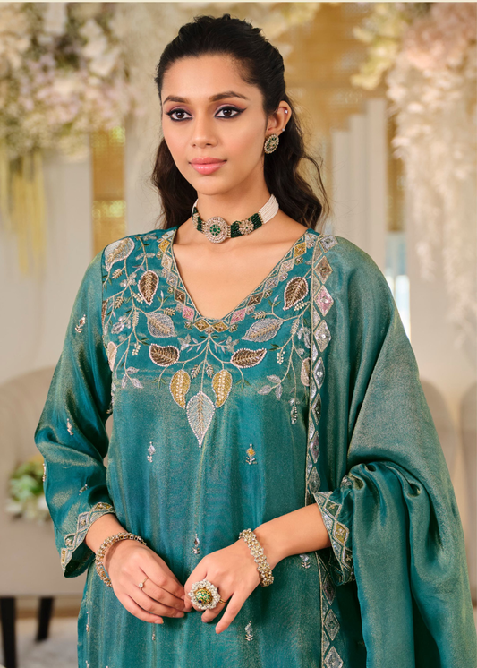 Designer Turquoise Silk Long Sleeve Pant Style Suit With Dupatta for Indian Wedding and Pakistani Festival