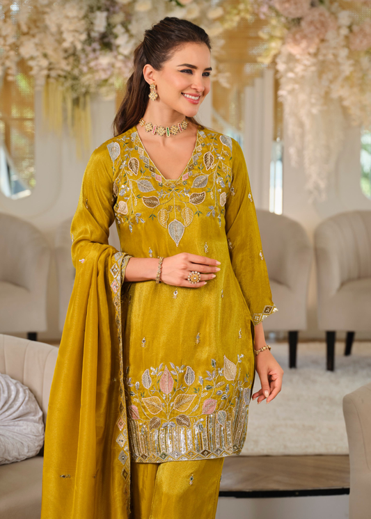 Designer Yellow Silk Long Sleeve Pant Style Suit With Dupatta for Indian Wedding and Pakistani Festival