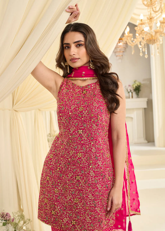 Designer Hot Pink Georrgette Sleeveless Indian and Pakistani Wedding Sharara Suit With Dupatta