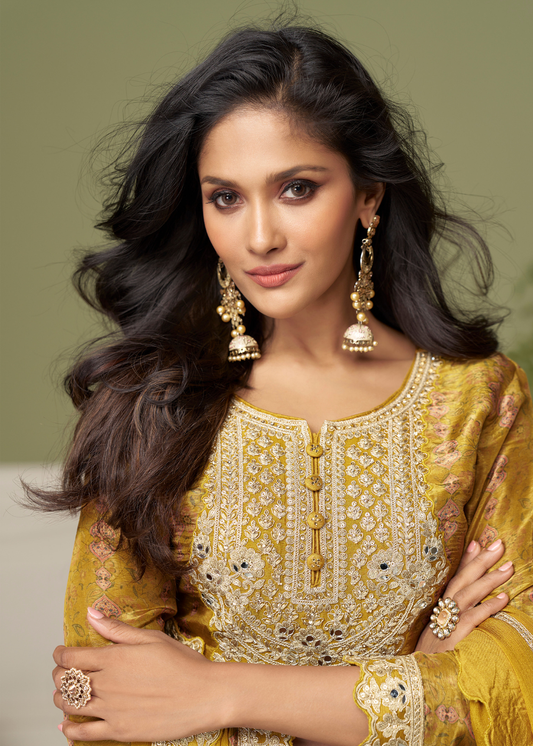 Designer Mustard Organza Long Sleeve Kurti Pant Set for Indian Wedding and Pakistani Festival