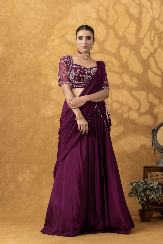 Party Wear Wine Dipped Moti Work Pre-Drape Saree
