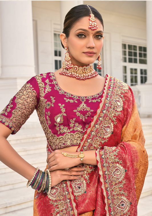 Mustard Gold and Deep Maroon Pure Silk Embroidered Saree with Matching Blouse-Jari, Cut-Dana, Moti Work