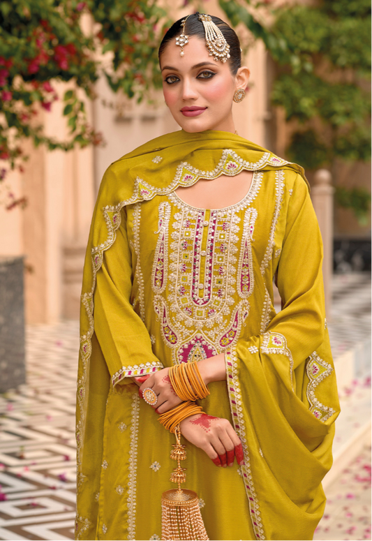Mustard Yellow Chinon Embroidered Suit with Pant & Dupatta for Pakistani Festival & Indian Wedding