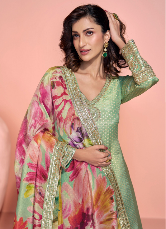 Pastel Green Chinon Silk Palazzo Suit with Floral Print For Indian Wedding and Pakistani Festival