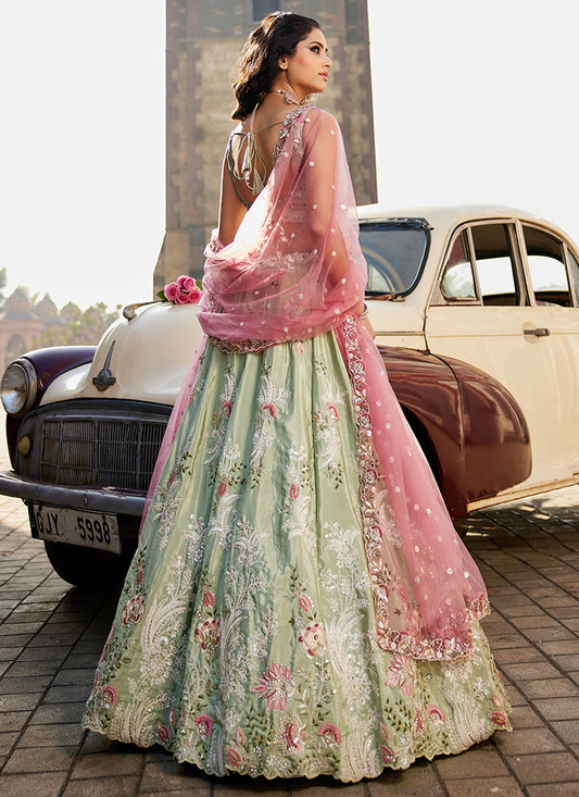 Pastel Green Satin Silk Lehenga Choli with Pink Net Dupatta- Embroidery and Sequins Work