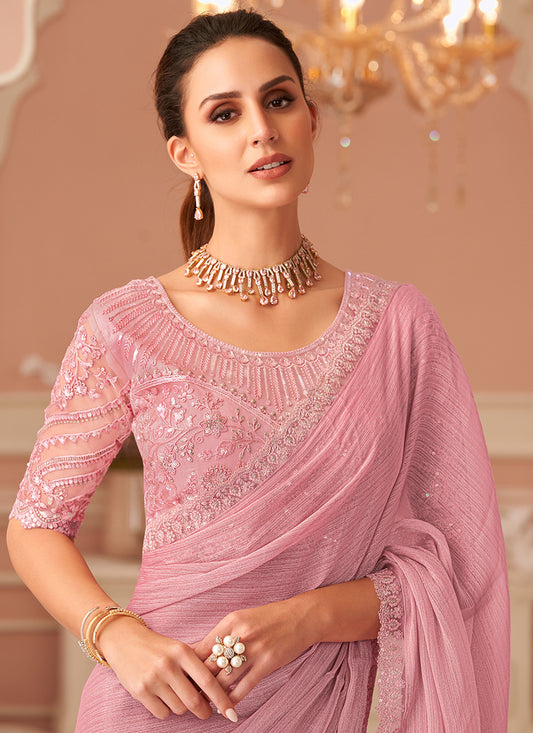 Pink Georgette Saree With Designer Pink Blouse -Ready to Wear Option for Indian Wedding and Pakistani Festival