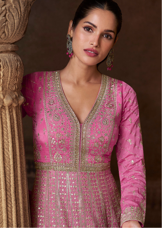 Pink Chinon Silk Indo-Western Designer Wear for Indian & Pakistani Wedding Functions