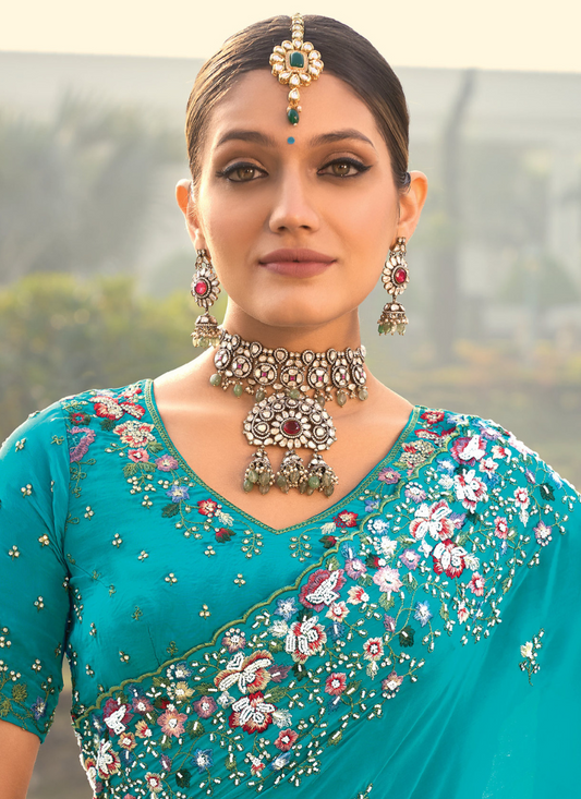 Teal Blue Mirror Work Lehenga Choli showcases mirror embroidery on velvet