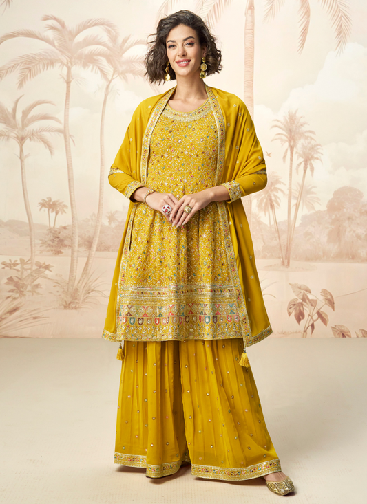 Yellow Chiffon Sharara Suit with Dupatta for Indian Pakistani Wedding and Festival –Long Sleeve, Multi Embroidery WorkRegular price From $203.00 CADRegular priceUnit price / per$700.00 CADSale price From $203.00 CADSale