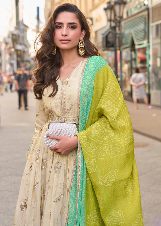 Designer Beige Embroidered Indo Western Simar Silk Anarkali Gown