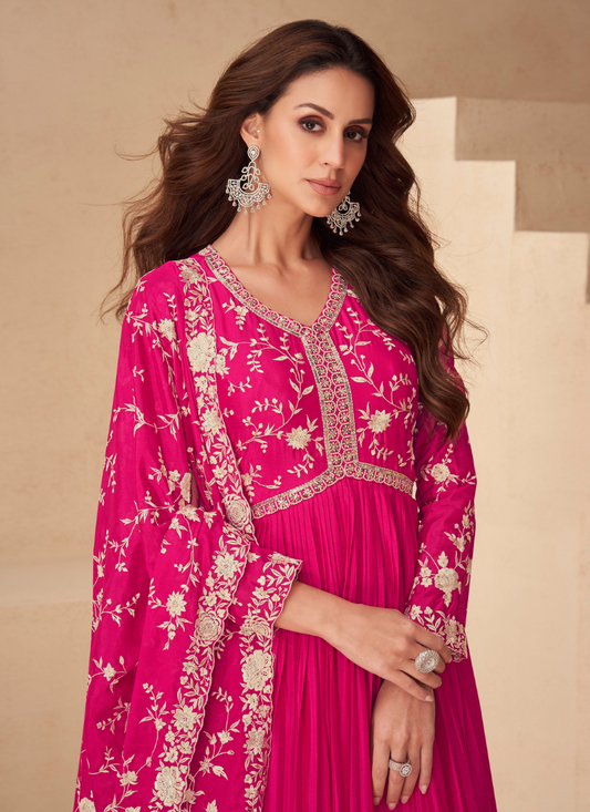Rani Pink Chinnon Silk Embroidery Anarkali Gown with Dupatta for Indian Festival and Pakistani Wedding - Thread Work
