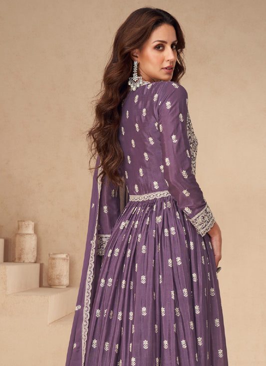 Purple Chinnon Silk Embroidered Anarkali Gown with Dupatta for Indian Wedding and Pakistani Festival