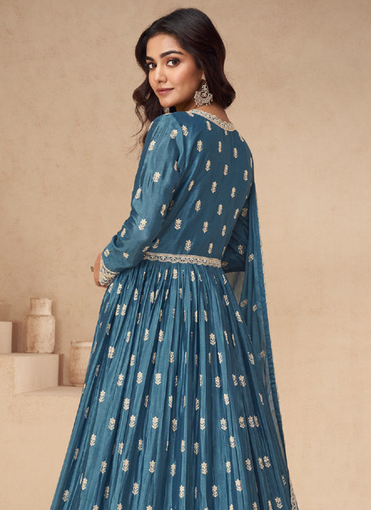 Blue Chinnon Silk Embroidered Anarkali Gown with Dupatta for Indian Wedding and Pakistani Festival