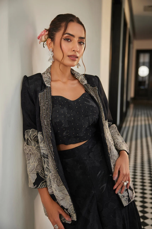 Designer Black Embroidered Floral Jacket with Flared Pants Set for Indian Pakistani Festival Party Wear