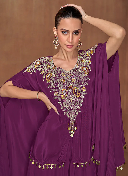 Designer Purple Chinnon Silk Embroidered Sharara Suit with Dupatta – Perfect for Indian Wedding & Pakistani Festival