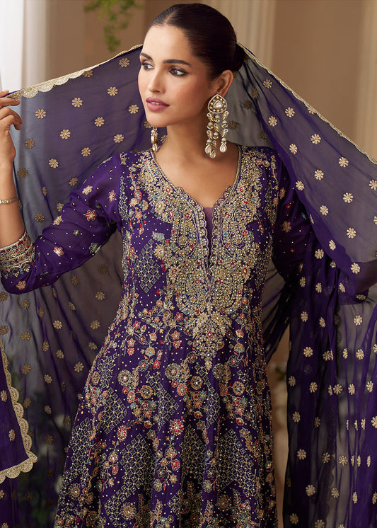 Designer Plum Embroidered Indo Western Chinon Sharara Suit
