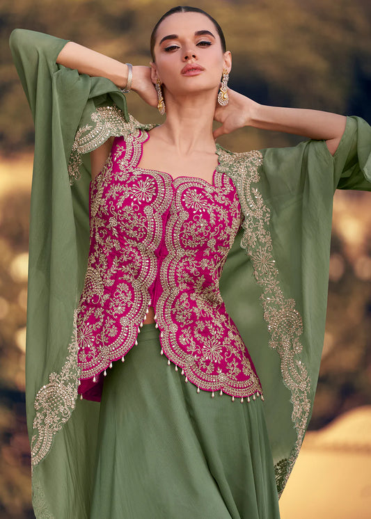 Designer Olive Green and Pink Chinon Cape Style Palazzo Suit with EmbroideryRegular price From $216.00 CADRegular priceUnit price / per$923.00 CADSale price From $216.00 CADSale