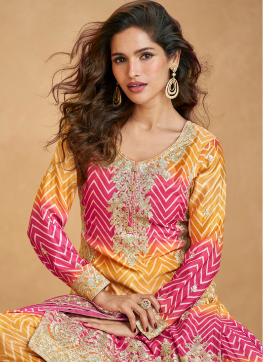 Pink and Yellow Chinon Silk Long Sleeves Sharara Suit with Dupatta – Indian Pakistani Wedding Festival Wear