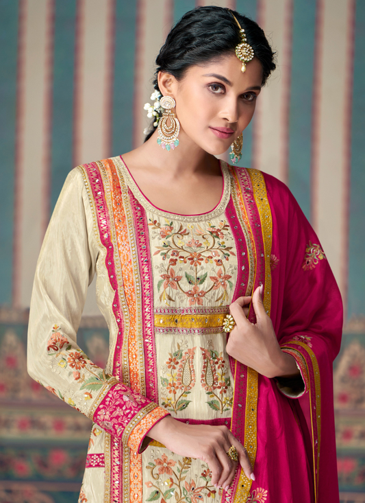 Both the Sharara and Gharara Suits are available in a variety of fabrics such as silk, chiffon, georgette, and velvet, with intricate embroidery, sequins, and beadwork to suit every occasion.