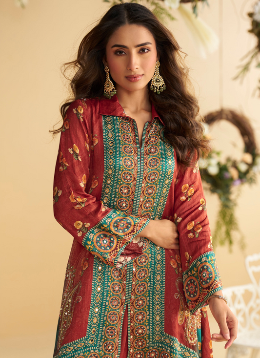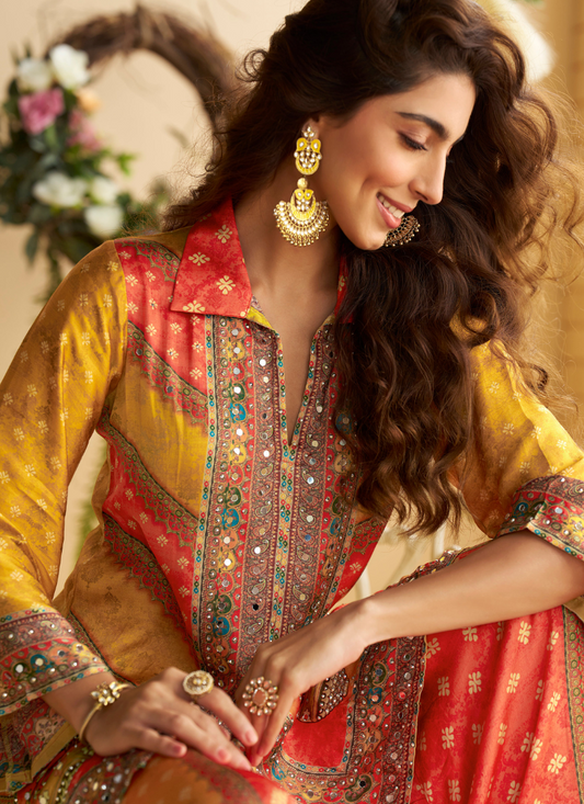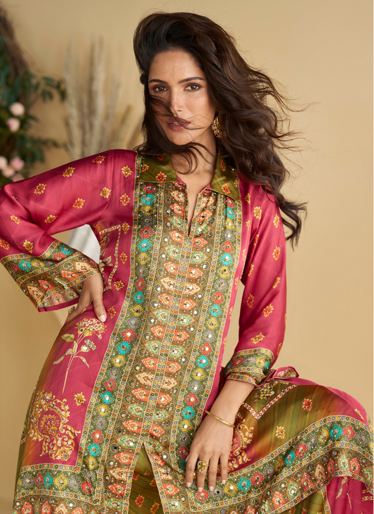 The sharara suit features wide-legged, flared pants that start at the waist and flow down seamlessly, creating a graceful and elegant look. Paired with a beautifully embellished kameez (top), a dupattas (scarf), and flattering sharara bottoms that are tight at the thighs and flare out at the bottom, this outfit exudes modern charm while retaining its traditional essence. It’s an ideal choice for Eid, weddings, and festive occasions, embraced by women worldwide for its fluidity and beauty.