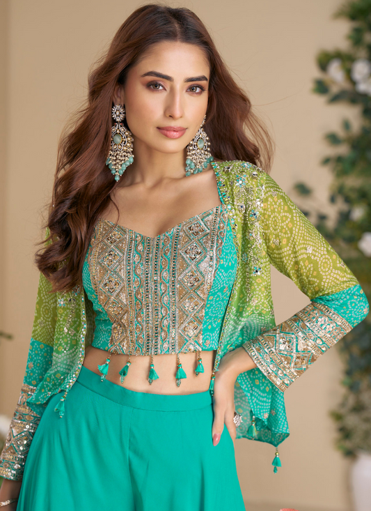 Designer Teal Green Chinon Silk Indo-Western Set with Embroidered Blouse and Shrug – Indian Pakistani Wedding LookRegular price From $209.00 CADRegular priceUnit price / per$839.00 CADSale price From $209.00 CADSale
