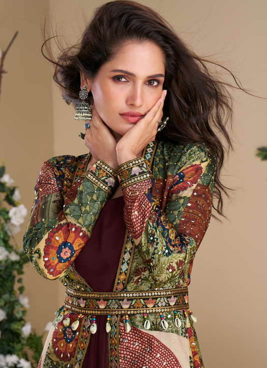 Designer Deep Wine Georgette Anarkali Gown with Multicolor Long Shrug