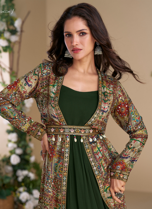 Designer Green Georgette Anarkali Gown with Multicolor Long Shrug