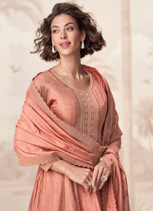 Peach Long Sleeve Silk Anarkali Gown with Dupatta for Indian Wedding Pakistani Festival