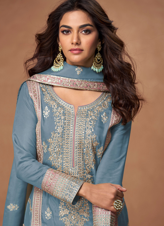 Blue Organza Long Sleeve Sharara Suit with Dupatta for Indian Weddings and Pakistani Festivals