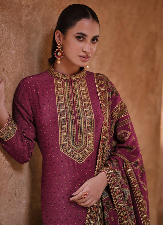Deep Purple Anarkali Silk Suit with Embroidery Work and Dupatta for Pakistani Weddings and Indian Festivals