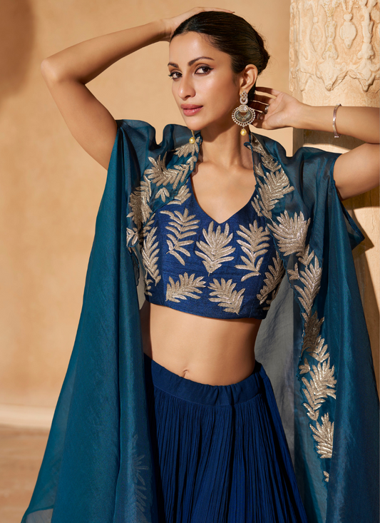Blue Embroidered Lehenga Set with Cape Dupatta for Pakistani Festival and Indian Wedding