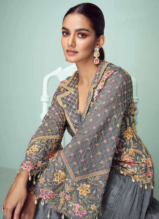 Grey Embroidered Jacket Style Lehenga for Festive Occasions