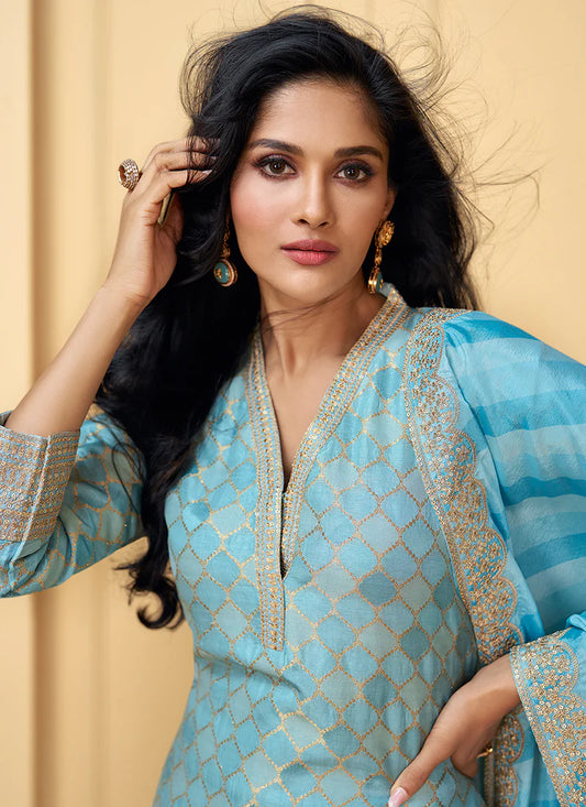 Designer Sky Blue Embroidered Silk Salwar Kameez