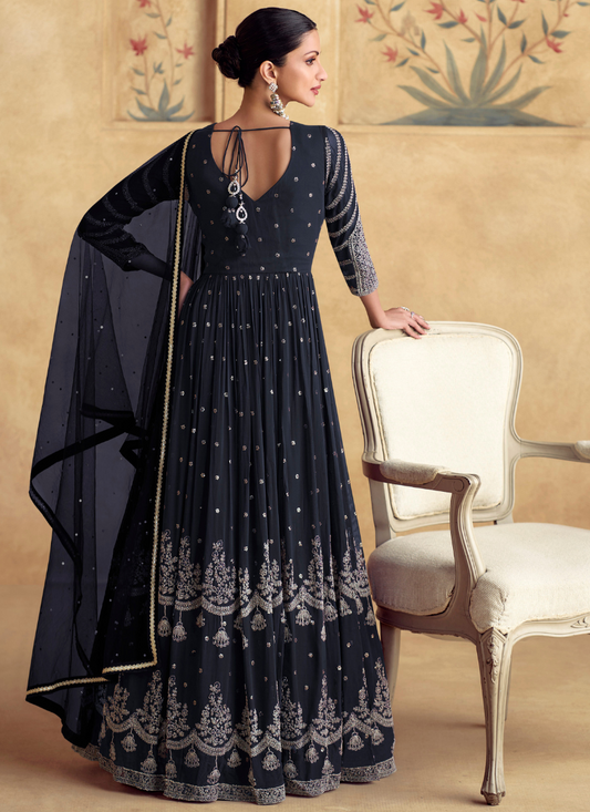 Dark Blue Georgette Embroidered Anarkali Suit with Dupatta for Pakistani Weddings and Indian Festivals