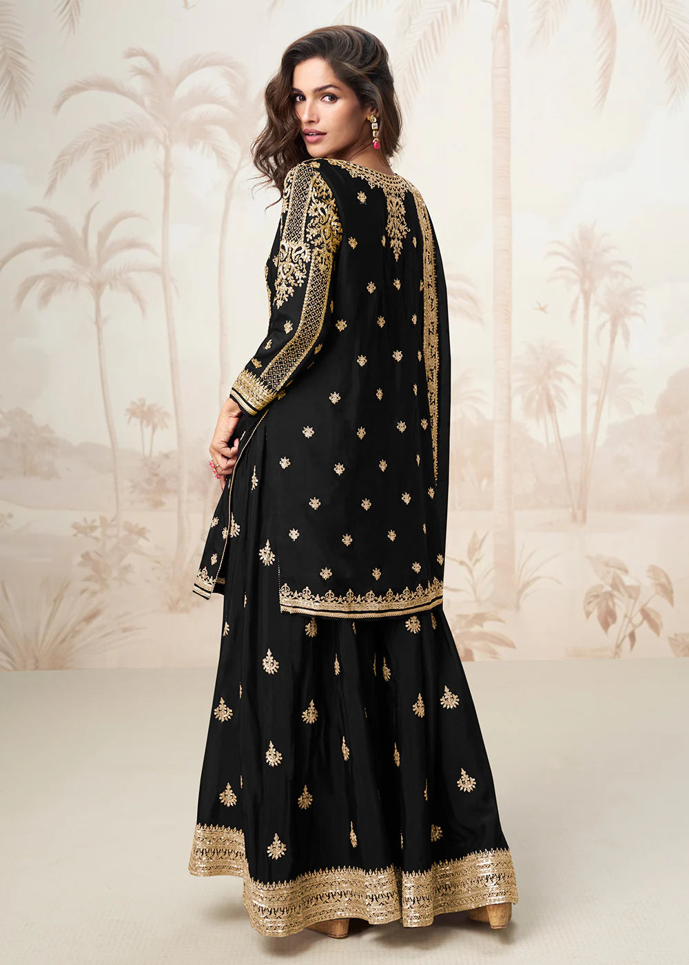 Black Chinon Silk Designer Sharara Suit with Embroidery – Pakistani Indian Eid & Wedding Wear