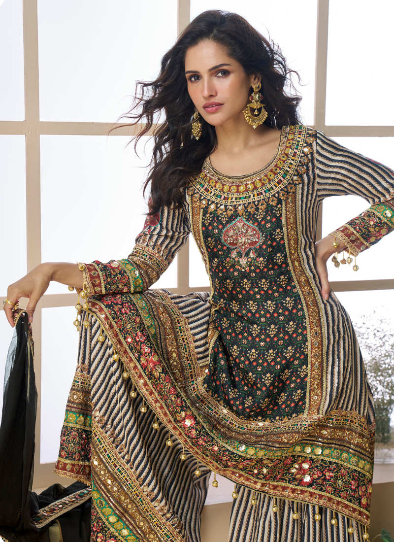 This black and gold sharara suit is crafted from soft Viscose Crepe Silk, enhanced with zari, resham thread, gota patti, beads, and sequins work. A stunning pick for Indian receptions, Pakistani sangeet nights, and festive wear.