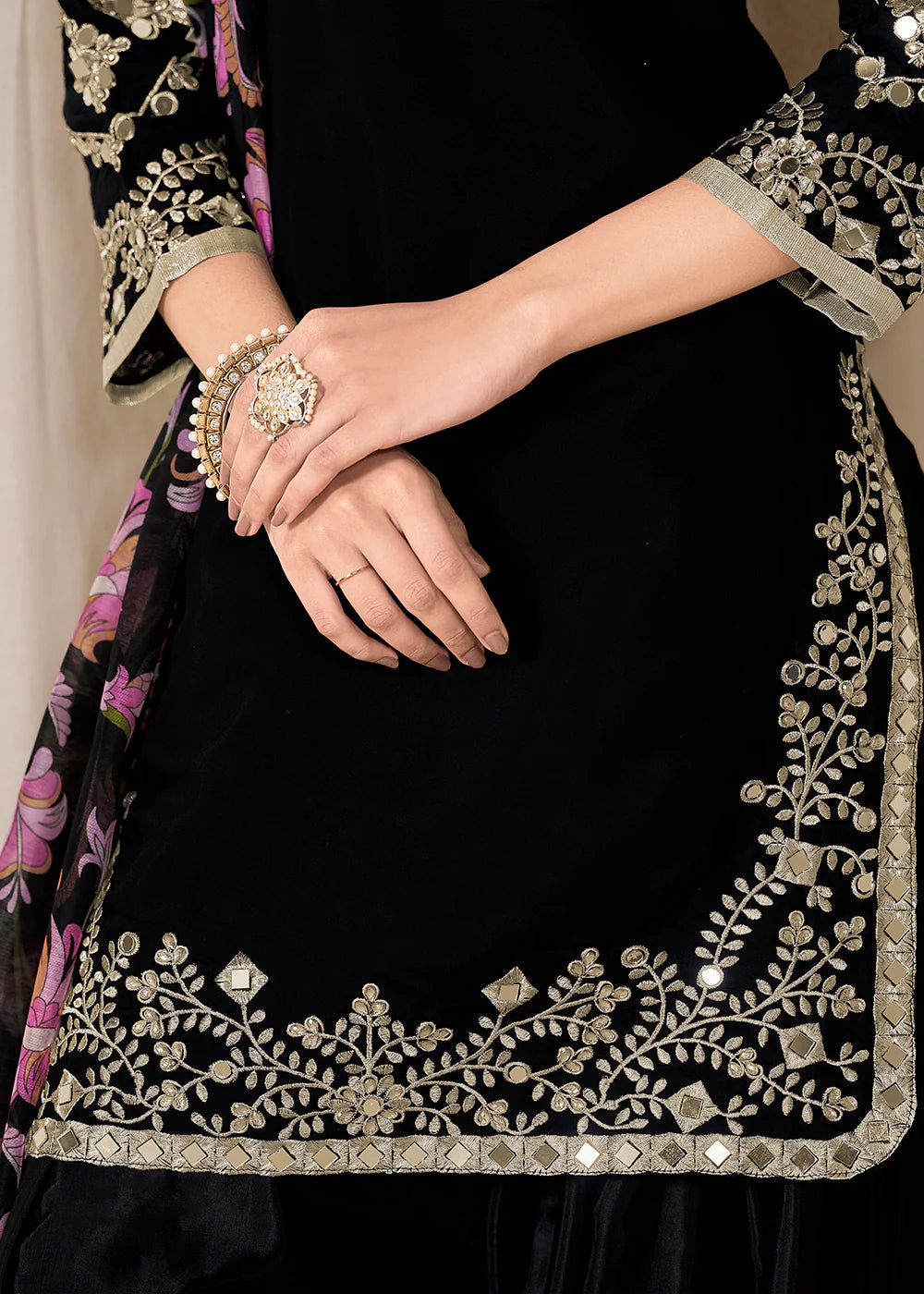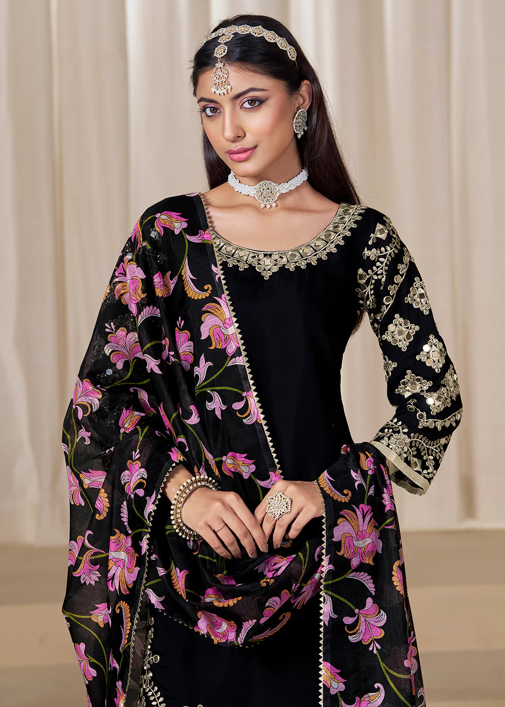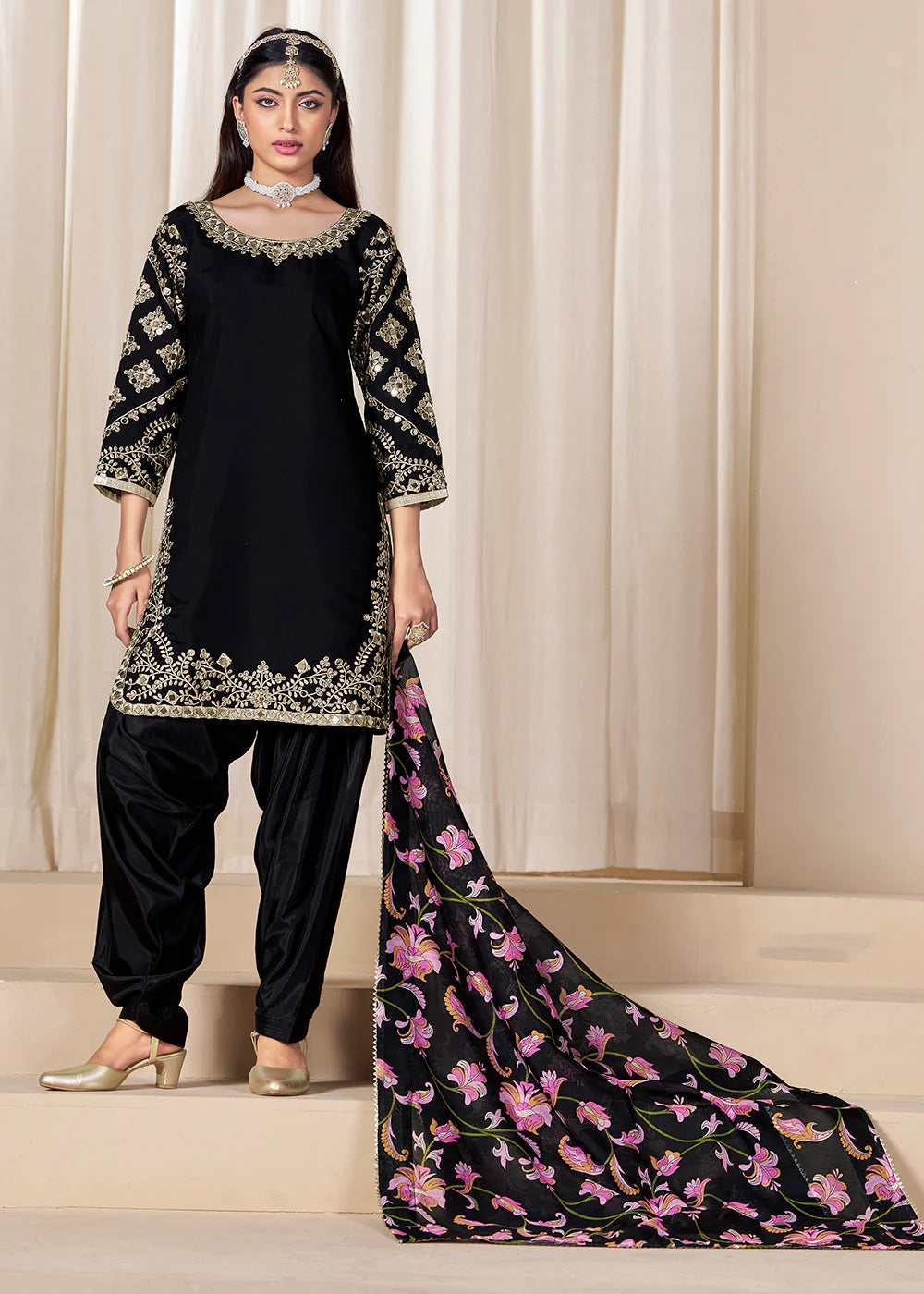 Elevate your ethnic wardrobe with this elegant black Punjabi salwar suit crafted in premium Roman silk. The neckline and sleeves feature exquisite golden embroidery, paired beautifully with a Chanderi silk dupatta showcasing vibrant floral embroidery in pink and purple. Completed with a soft Santool fabric inner and bottom, this outfit is perfect for Indian festivals, Pakistani weddings, and Punjabi celebrations.