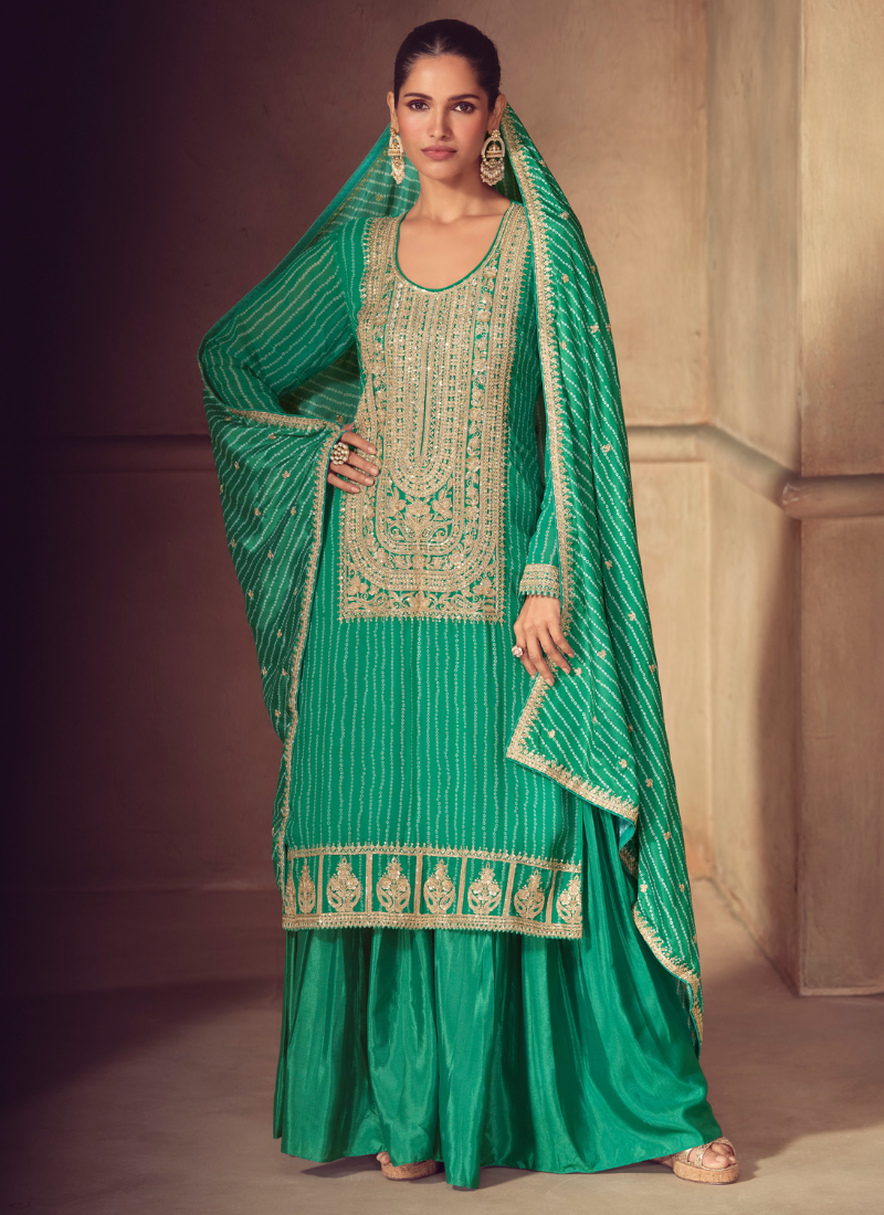 Bottle Green Chinon Sharara Suit is designed with royal embroidery and zari detailing, perfect for Pakistani Eid looks and Indian festive occasions. Flowy and elegant, it blends traditional craftsmanship with modern charm.
