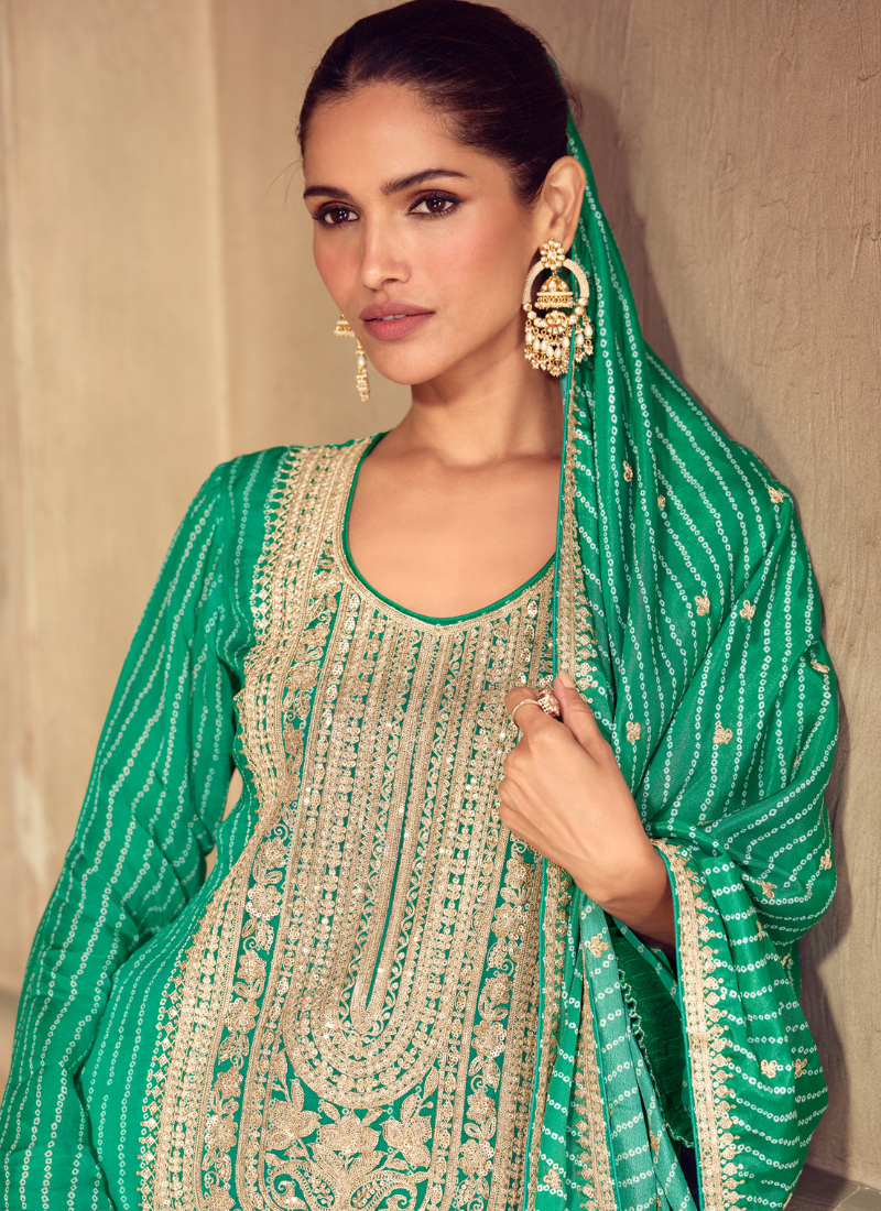 Bottle Green Chinon Sharara Suit with Dupatta for Indian Wedding and Pakistani Festival