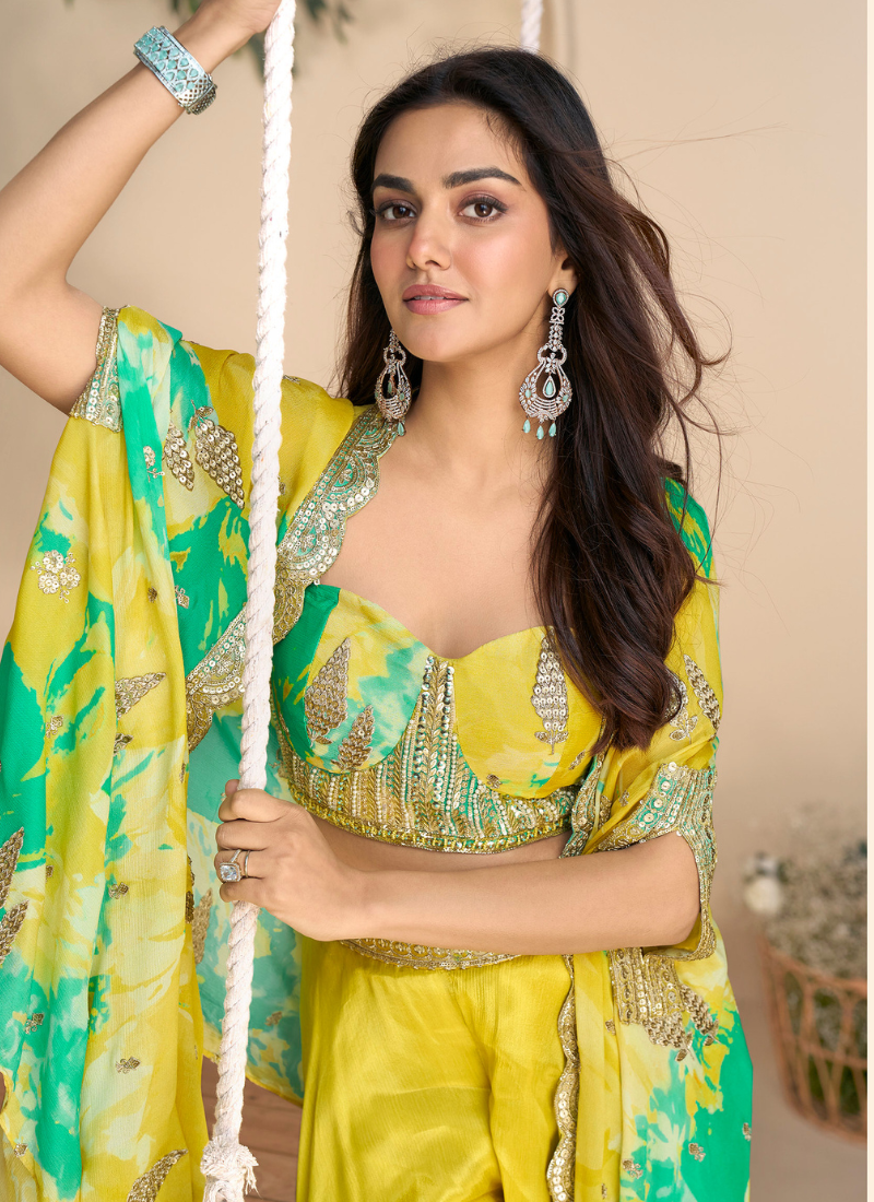 Elevate your festive wardrobe with this designer Cape Style Sharara Set crafted in luxurious Chinon fabric. Featuring a beautifully embroidered blouse, soft draped sharara bottoms, and a statement floral cape-style dupatta, this ensemble is perfect for Indian and Pakistani wedding events, Haldi, Mehndi, and festive celebrations.