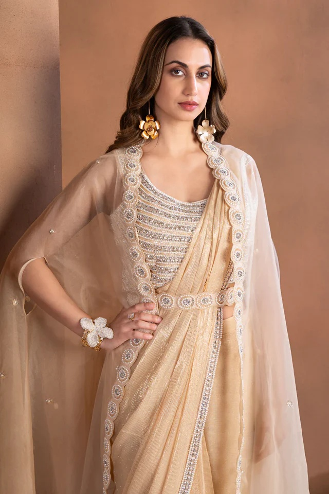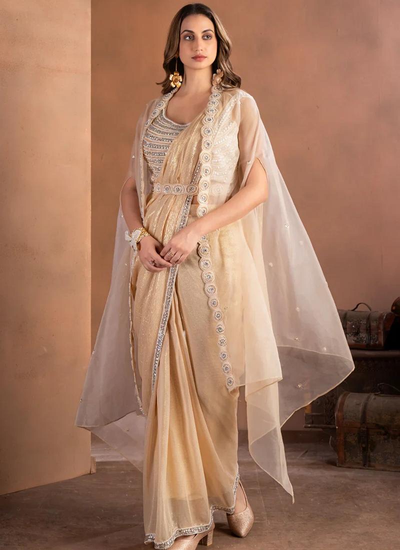 Step into effortless elegance with this champagne beige pre-draped saree. Adorned with silver shimmer and lace detailing, it offers a ready-to-wear silhouette with graceful fall. The set includes a matching blouse and sheer dupatta, making it perfect for Indian weddings, Pakistani celebrations, and festive evenings.
