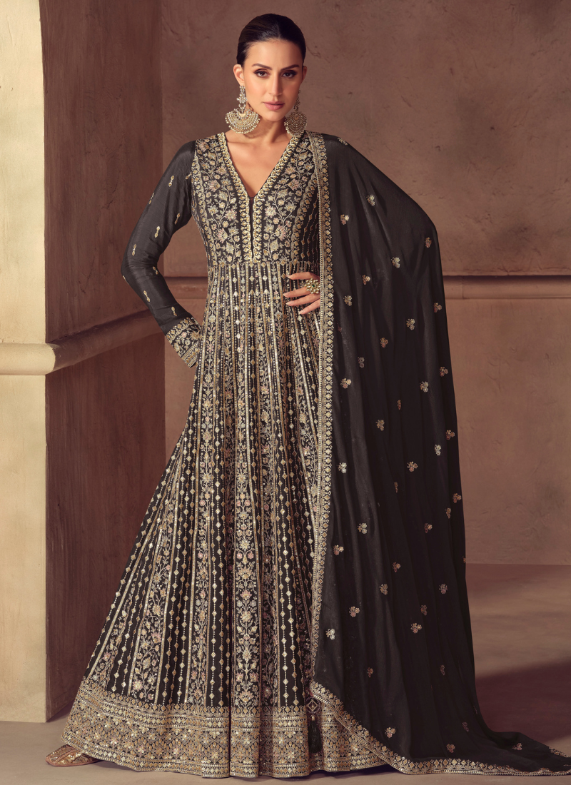 Elevate your festive wardrobe with this dark brown Anarkali gown, gracefully tailored in soft Chinon fabric. Featuring elegant sequin and zari embroidery, the gown flows into a beautiful flare and is completed with a sheer matching dupatta. Perfect for Diwali, Indian and Pakistani weddings, and special events. Available in plus sizes with free worldwide shipping.