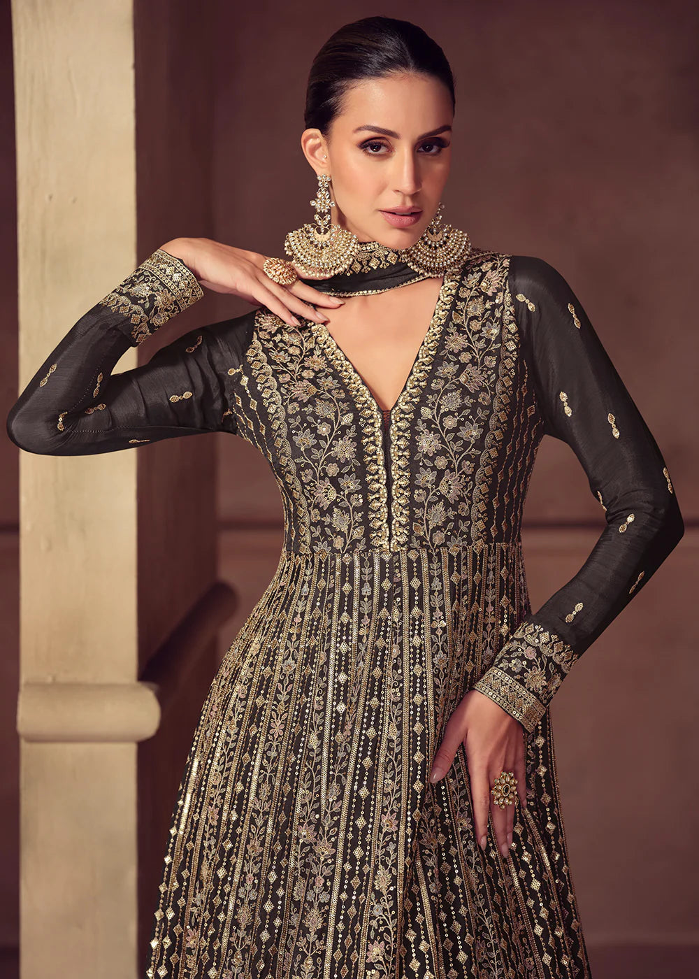 Designer Dark Brown Chinon Anarkali Gown For Party Wear
