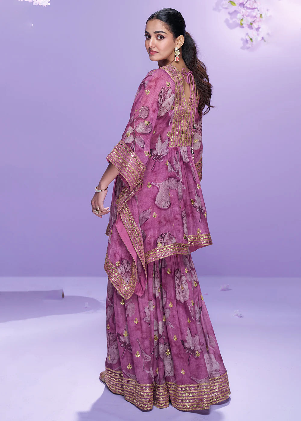Designer Dusty Pink Floral Georgette Kaftan Sharara Suit For Indian Wedding and Pakistani Festival